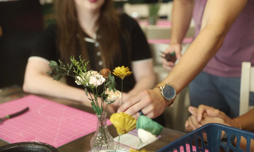 Inspiration lives here at every table. Our open seating schedule means you can set out for creativity in action — colorful blooms, hands at work, and finished arrangements full of joy and beauty — every single day.